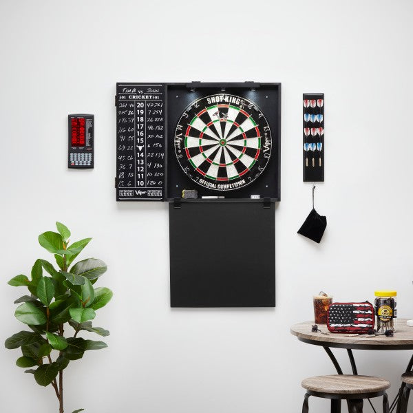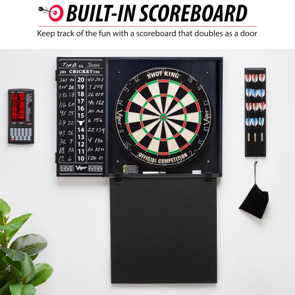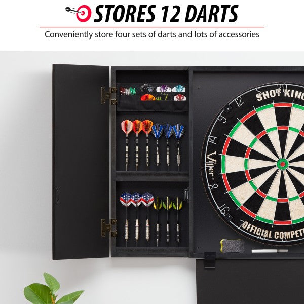 For a one-stop darting solution look no further than the Viper Steadfast Dart Backboard with the Shot King Sisal Dartboard. The Shot King steel tip dart board is made with self-healing sisal fibers and a galvanized steel wire spider to ensure it lasts long. It features a staple-free bullseye to reduce bounce-outs and a moveable number ring to promote longevity. The Shot King easily mounts into the Steadfast Backboard's preinstalled mounting bracket for a no-nonsense installation. This backboard has a built-in scoreboard for games of cricket and 01, and it opens up to reveal storage space for four sets of darts, a total of 12, and pockets for flights and accessories. This set includes two sets of starter darts, chalk and eraser, mounting hardware, and a wall protector that hangs below the backboard.