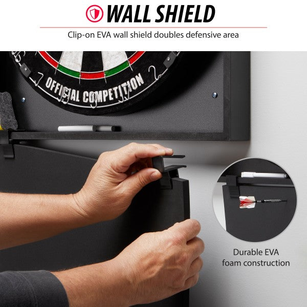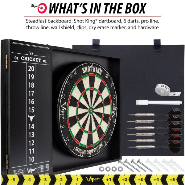 Includes Steadfast backboard, Shot King Sisal Dartboard, two sets of starter darts, chalk and eraser, mounting hardware, and a wall protector