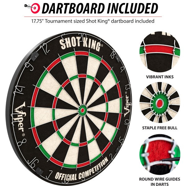 Shot King steel tip dartboard features a staple-free bull, rounded galvanized spider wire, and a moveable number ring