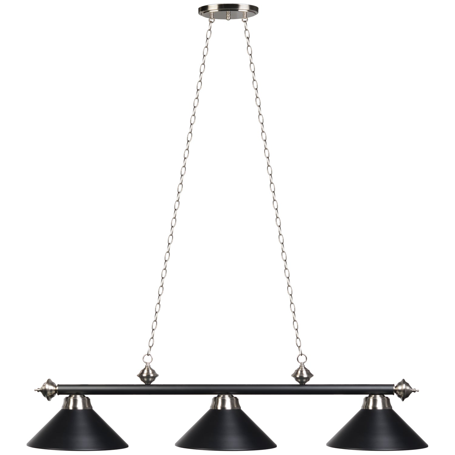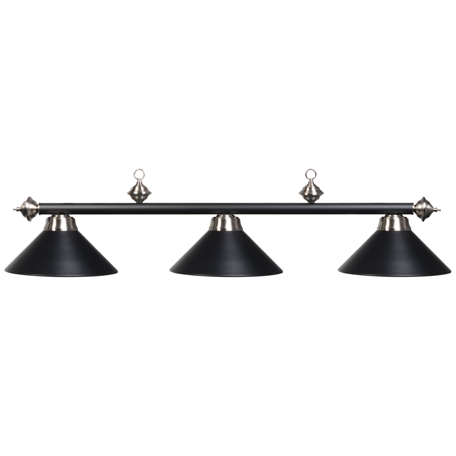 Classic and sophisticated, this 54 inch, 3-light metal billiards light fixture is exactly the upgrade your game room needs. Offering plentiful lighting for the home bar or for a pool table, this fixture features three metal cone shades to deliver directed illumination. Three foot chains on either side suspend this stylish fixture from the ceiling. The metal bar and shades feature matching finishes for a composed, elegant look.