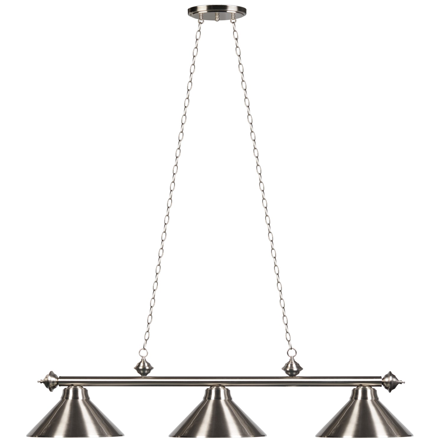 Classic and sophisticated, this 54 inch, 3-light metal billiards light fixture is exactly the upgrade your game room needs. Offering plentiful lighting for the home bar or for a pool table, this fixture features three metal cone shades to deliver directed illumination. Three foot chains on either side suspend this stylish fixture from the ceiling. The metal bar and shades feature matching finishes for a composed, elegant look.