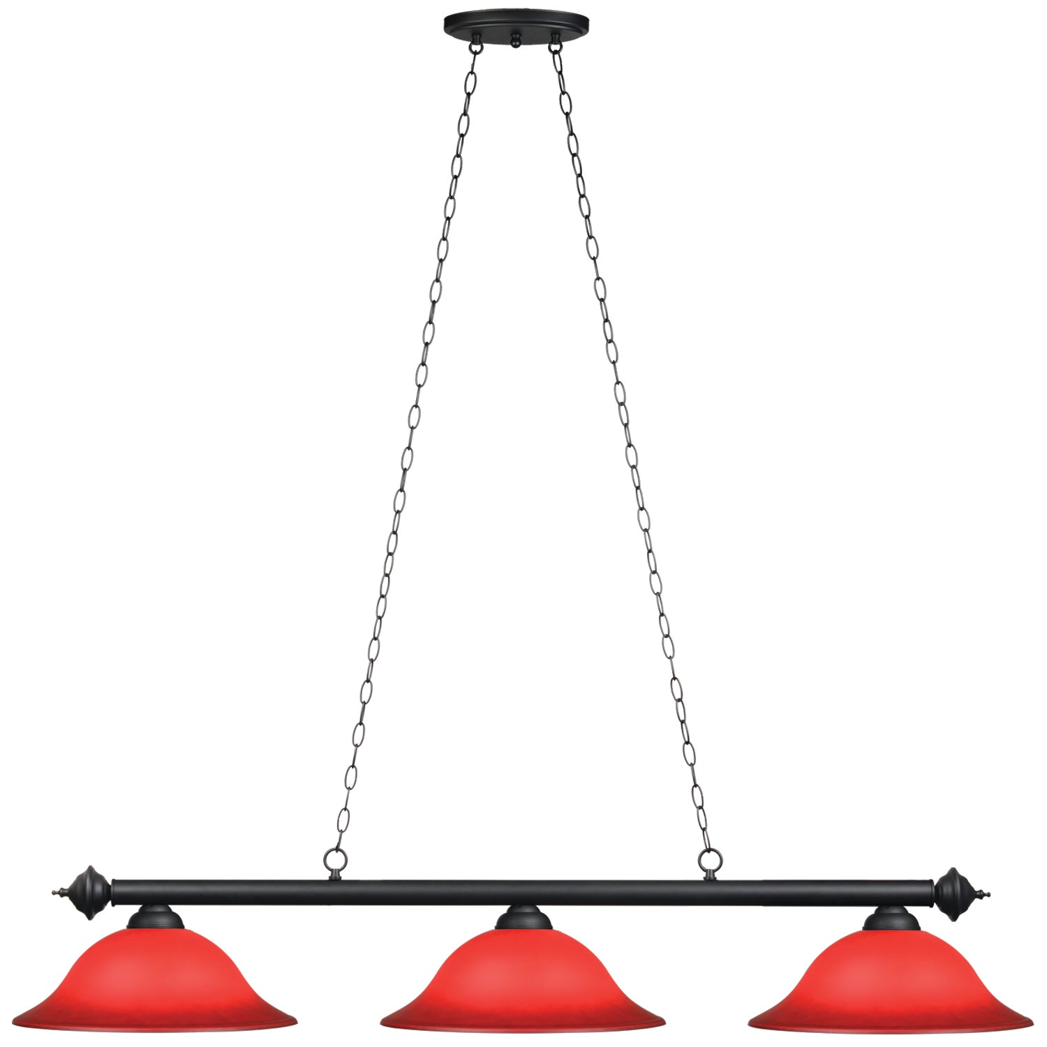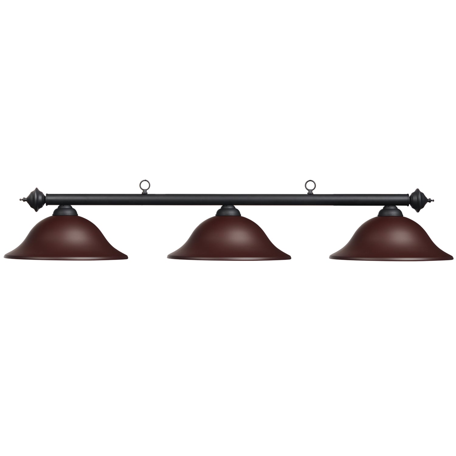 A classic matte black bar finish and painted burgundy shade ensures a rich, warm look for this 60-inch three-light billiard pendant.
