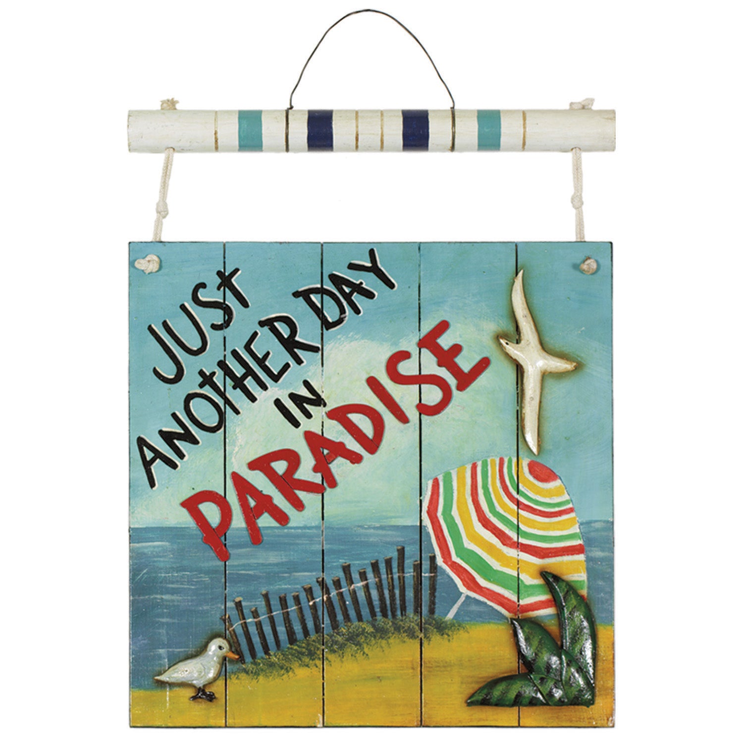 Accent a beach cottage or spectacular backyard oasis with this charming tropical theme outdoor wall sign. Announcing that it’s “just another day in paradise†the sign is made with a hand-painted finish. A UV protective coating ensures that the design remains vibrant and eye-catching. The sign itself features solid wood construction with polyresin detailing that brings dimensionality.
