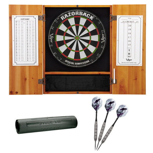 Get your dart game started off right! This comprehensive bundle includes everything you need to make a stylish addition to your game room. Each set includes a premium dartboard cabinet, a sisal dartboard, a padded dart mat and a set of Underground Raven Steel Tip darts. The dartboard cabinet is made from solid pine and constructed with box joints and bronze hinges for a classic look. A dry erase scoreboard and out chart come included with the cabinet. The regulation sized dartboard features a razor thin spider, to reduce bounce outs. Made from self-healing sisal fibers, you will surely enjoy your dartboard for years. A heavy duty dart mat ensures that you will be throwing from regulation distance, for soft tip and steel. Included are a set of 25g Steel Tip darts, specially knurled for excellent grip. They feature precision machined brass barrels, coated to resemble tungsten, ensuring aerodynamic flight.