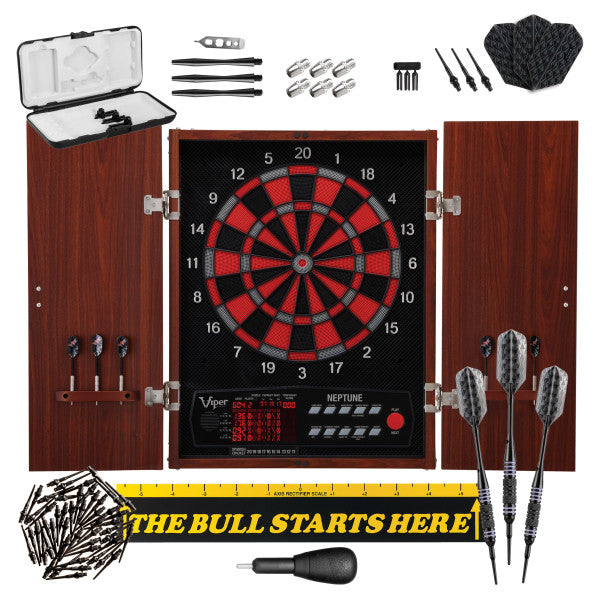 Complete your game room with the perfect dartboard bundle! This premium bundle begins with the Neptune Electronic Dartboard. Featuring the regulation size, 15.5" dartboard target face the Neptune features built-in cabinet doors, eliminating the need for extras. The Neptune features 57 dart games, including the exclusive Spanish and Minnesota Cricket, and 307 scoring options to assure that you'll never run out of ways to put your darting skills on display. With Target Tested Tough segments, you don't need to worry about your board breaking after only a few dart nights. Furthermore, the Neptune features precision engineered concave segment holes that lock in your shots and ultra-thin spider, to help eliminate bounce outs. The included dart sets are the Viper Bobcat darts with adjustable weights. The Fat Cat Tip Remover allows you to keep your board free of broken tips, extending its life. The signature Dart Throwline will keep your toes behind the line in style. To ensure many game night ahead, an extra box of 50 2BA Tips are included.