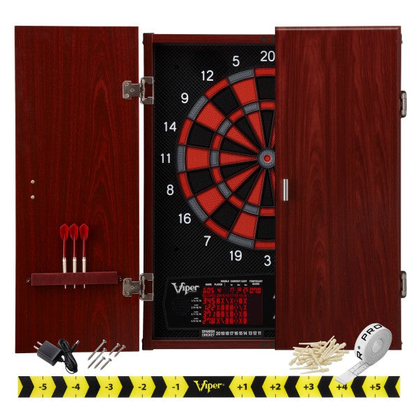 Includes Viper Neptune Electronic Dartboard and Cabinet Hybrid, Viper Bobcat Adjustable Weight Soft Tip Darts, Fat Cat Tip Remover, Viper "The Bull Starts Here" Throw Line Marker, and Viper Tufflex Tips II 2BA thread 1.25" long 50Ct Soft Tip Dart points