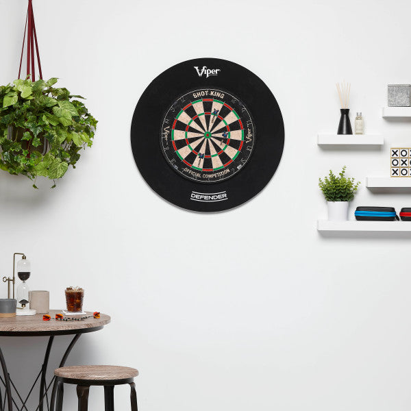 The Viper Defender I Dartboard surround is the easiest way to protect your walls from errant dart throws. The EVA Foam is 1" thick so you don't need to worry about darts penetrating through, but it's also light enough to easily hang on your wall without any extra support. Installation is incredibly easy, simply snap the segments together and place it onto your dartboard. To make things easy, this surround is compatible with both 18" and 17.75" regulation sisal dart boards. The included adhesive compression band can be used to ensure a tight fit on either sized dartboard so you don't need to worry about darts sliding by. Dartboard and darts are sold separately.